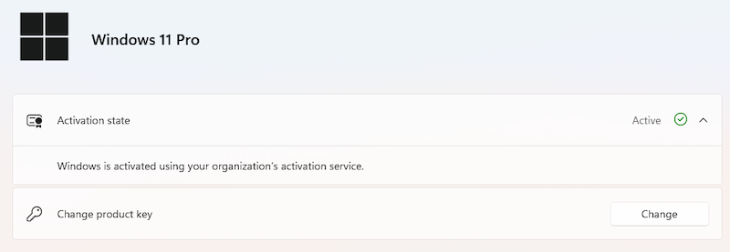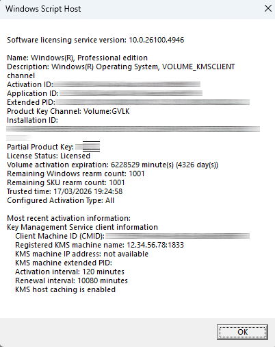 The Windows installation looked activated, but there was no OEM key stored in the BIOS/UEFI, and the system was not using a normal personal digital license either. Instead, Windows reported that it was activated using an organization's activation service. That means this installation was using KMS / volume activation, which is something normally used by companies and schools to activate many machines at once.