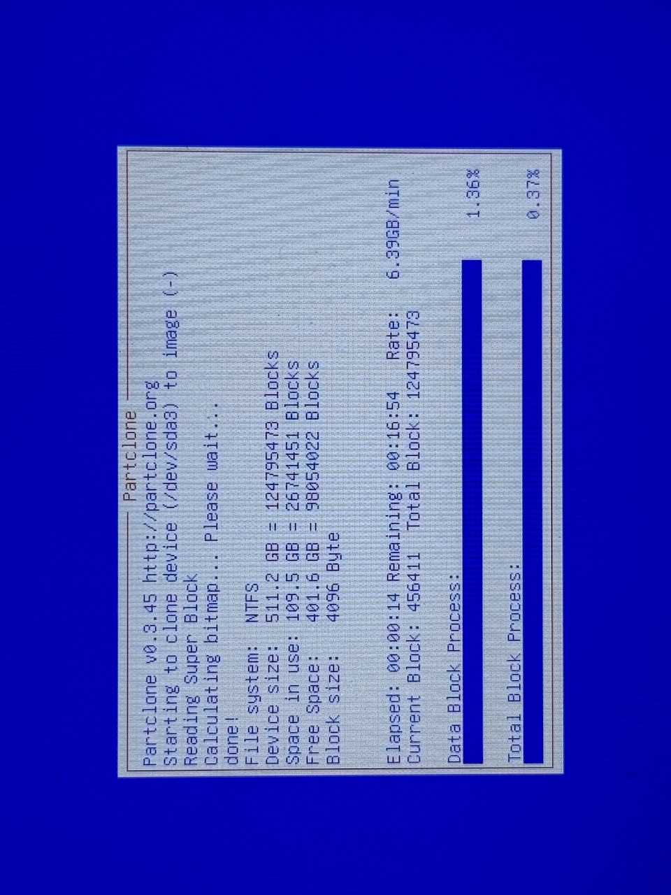 After the final confirmation, Clonezilla started backing up the disk.