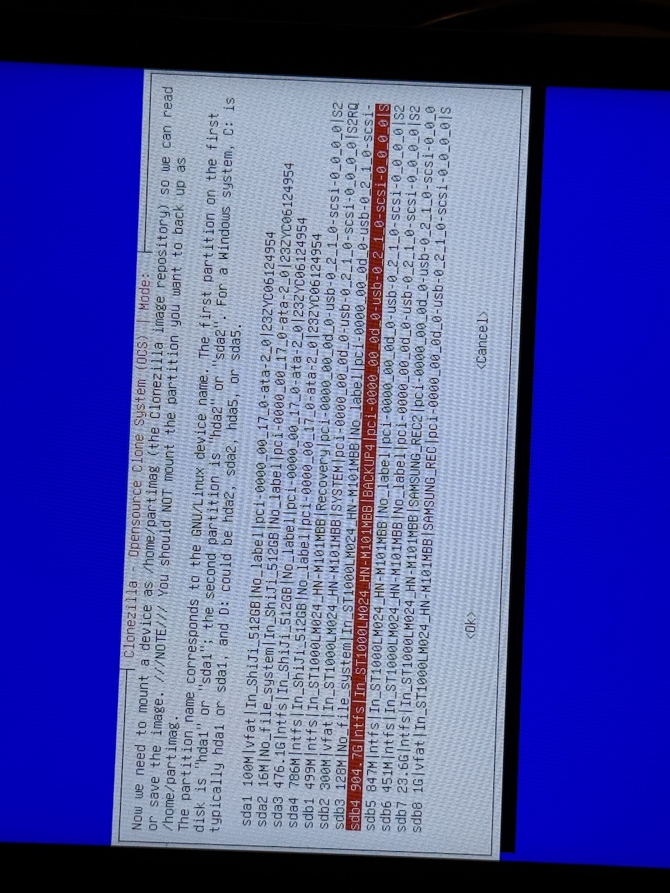 Clonezilla then scanned the connected devices and showed: