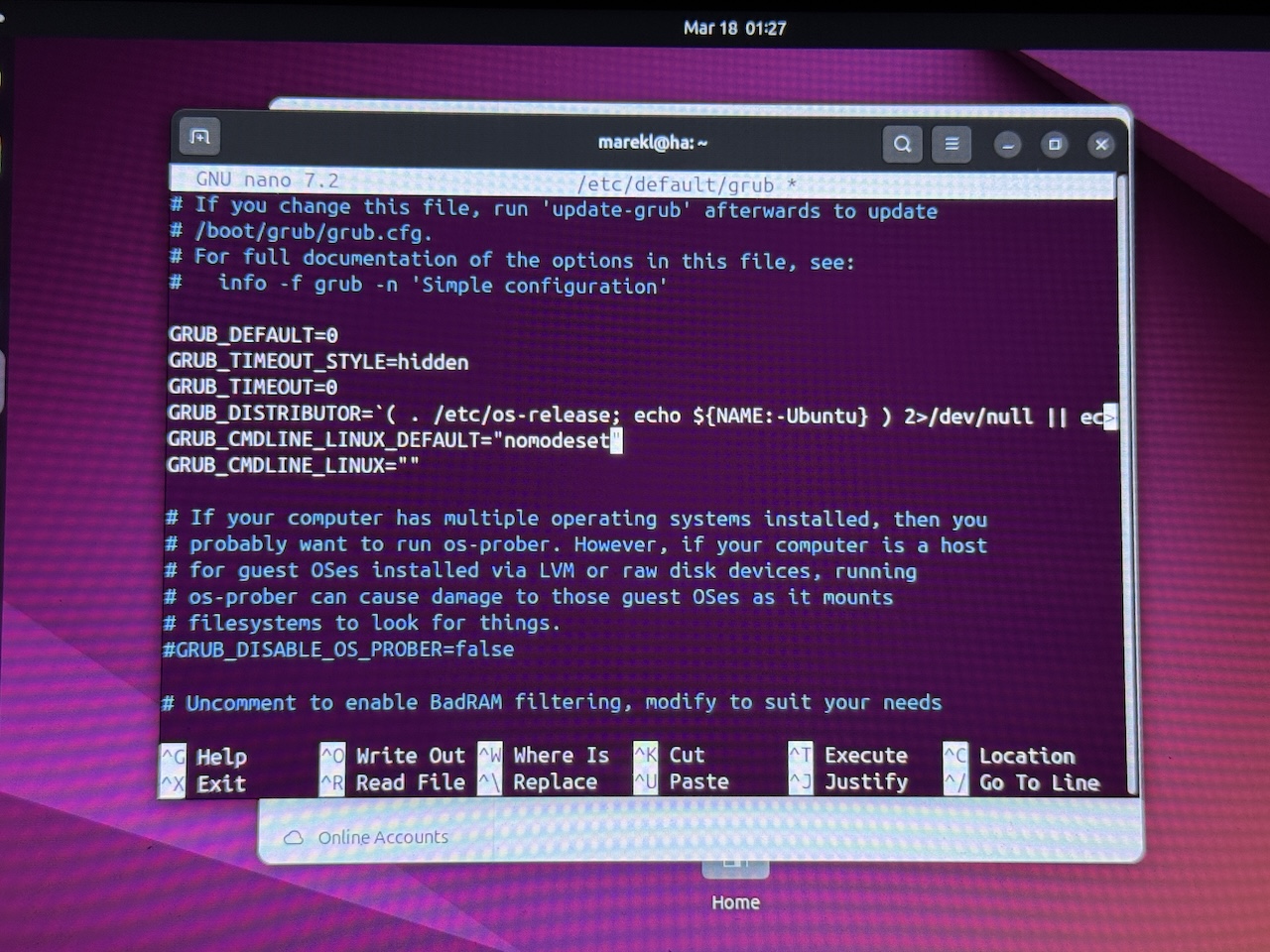 GRUB_CMDLINE_LINUX_DEFAULT="nomodeset"Then I ran: