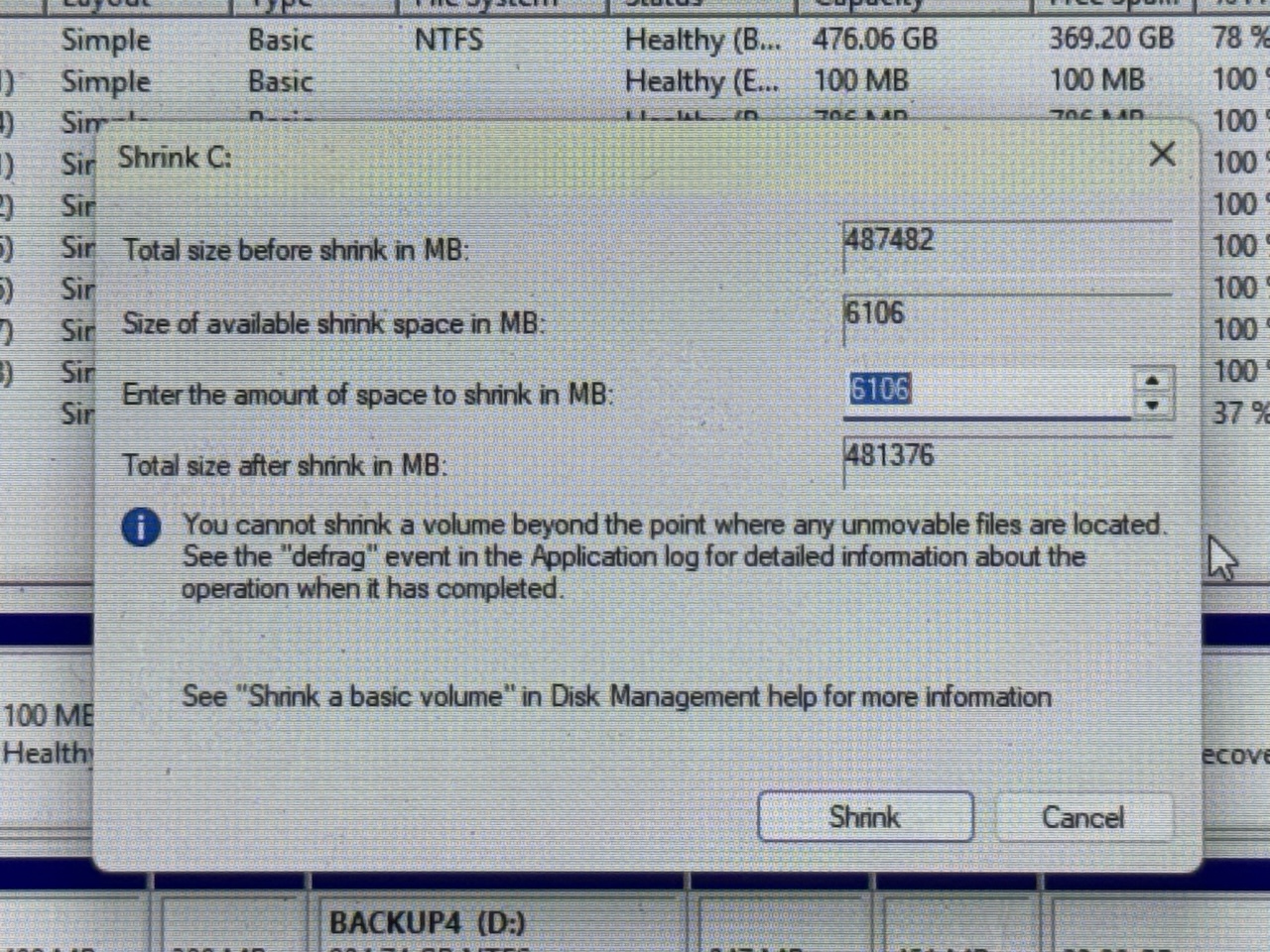 Still, even after all that, Windows remained stubborn and offered the exact same ridiculous amount of shrink space.