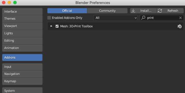 Click on the Add-ons tab and search for an extension called 3D-Print Toolbox. When you type 'print' into the search bar, it should show up. Mark the checkbox to enable it.