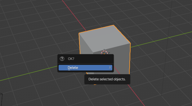 Inside Blender, first we will get rid of the default Cube model by selecting it with the left mouse button, then clicking on X, and finally pressing the Enter key.