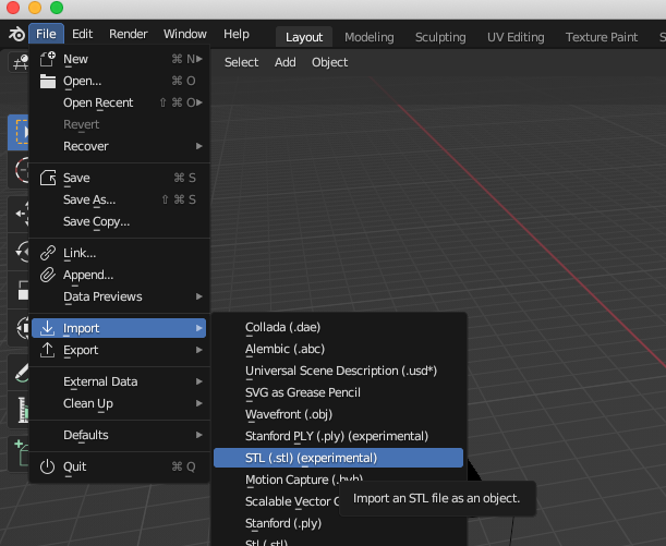 Then, we import the STL file by selecting File -> Import -> STL from the menu.