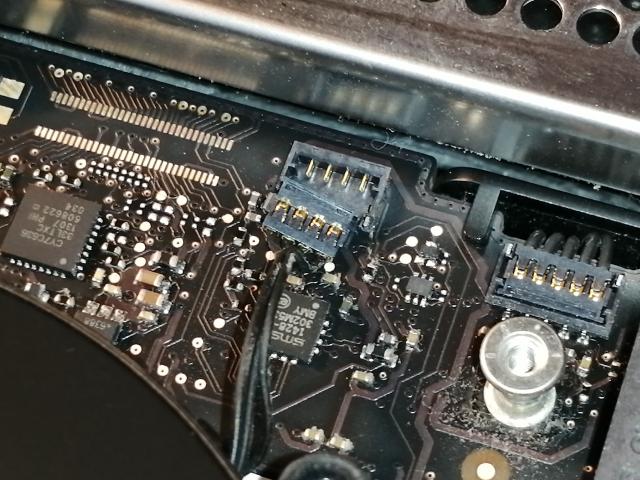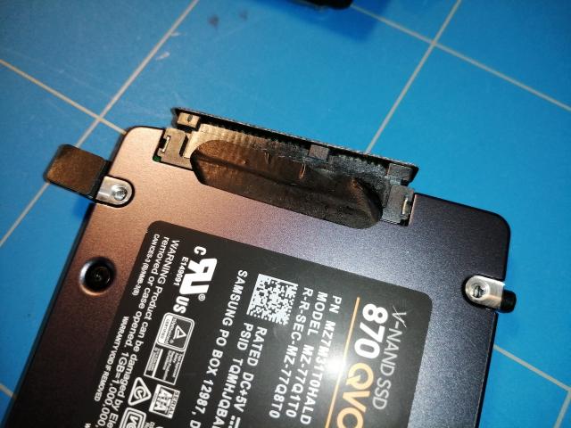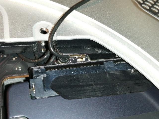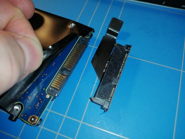 Now carefully peal off the black tape that holds the SATA connector and remove it. You won't need the plastic cover, but keep the black adhesive tape.