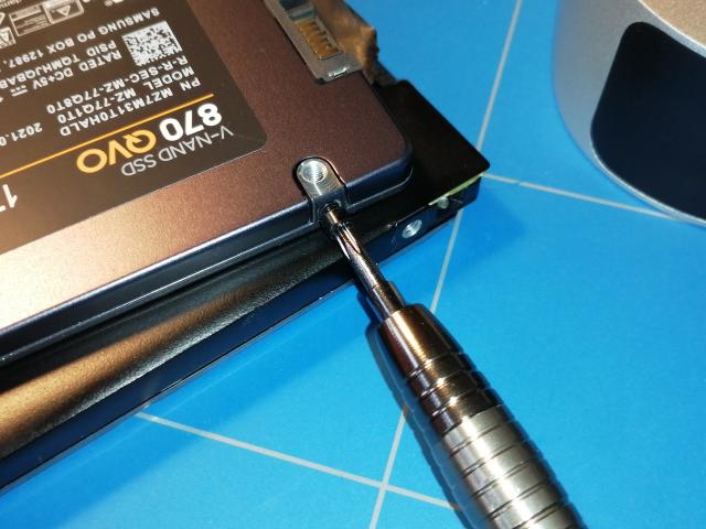 Remove the 2 screws on the side of the hard disk and screw them back to the new SSD hard drive.