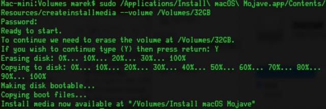 sudo /Applications/Install\ macOS\ Mojave.app/Contents/Resources/createinstallmedia --volume /Volumes/MyVolume