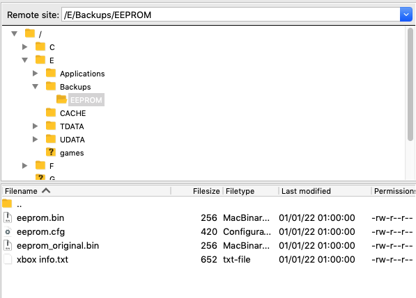 Then navigate to the folder /E/backups/EEPROM and copy all the files from that folder to your computer. The file eeprom.bin contains the HDD key after you have changed it to all 1s and eprom_original.bin is your original key. Store these files safely.