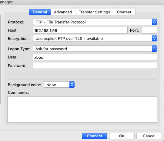 Now we can copy the backup of the EEPROM file to our computer. To do that, you can use an FTP program like Filezilla. Make sure your Xbox is connected to your network, then create a new FTP connection inside your FTP program to the IP address that is shown on the right corner of your screen. Mine was 192.168.1.58. The connect using username: xbox and password: xbox.