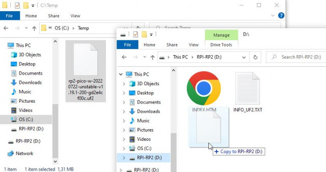 On Windows, the Pico W should get recognised as a removable drive. In my case, it was the D drive. You can then drag and drop the downloaded Micropython binary to that drive. After it is done, the Pico W will reboot automatically.