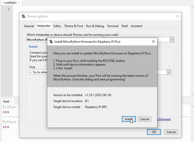You can also install or update the MicroPython firmware by clicking the install firmware link at the bottom of this window.