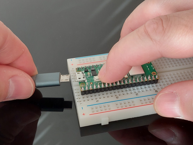 Then connect the Pico W to USB while holding the white BOOTSEL button.