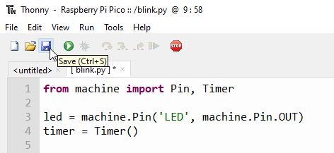 To test it copy this blink code inside Thonny editor. Notice that the LED is not connected to GPIO 25 on the Pico W anymore, but it connects to the GPIO pin 0 of the wireless interface which has a define: WL_GPIO0. You can also use the name 'LED'.