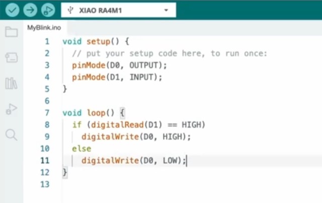 To check if the button is working we are going to define another pin as input. Then we change the working of the LED so that it will be lit only when the state of the button is HIGH. In our case it should be when the button is not pressed. If the button is pressed we will turn off the LED.