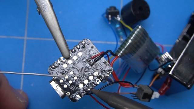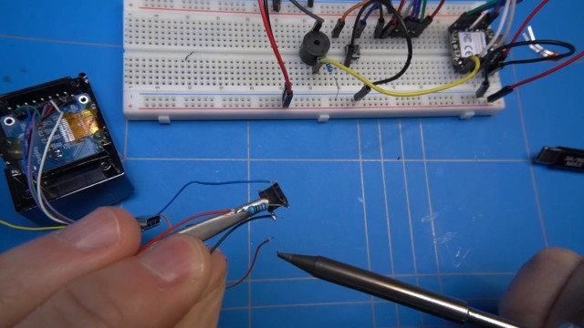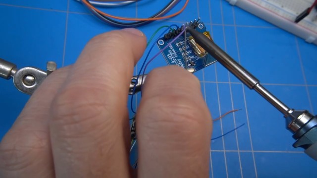 It's time to solder the wires on the microcontroller to the display. Using the helping hand to hold the screen securely makes soldering the wires to it much easier.