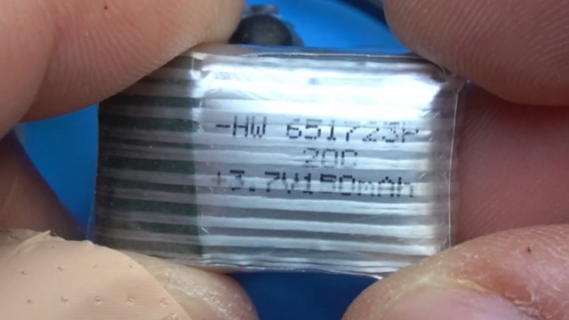 I didn't have any loose batteries that were that small, but I have this old drone that broke down and it's using this small HW 651723P 3.7 volts and 150 milliamp LiPo battery, which I think will be perfect to use in this setup.