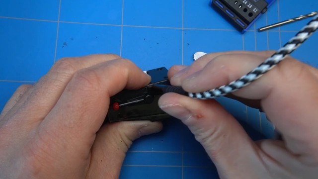 It's a 3mm LED and the legs are 2.5 mm apart. Let's drill 2 small holes with the dremel tool. And the LED fits nicely like this.